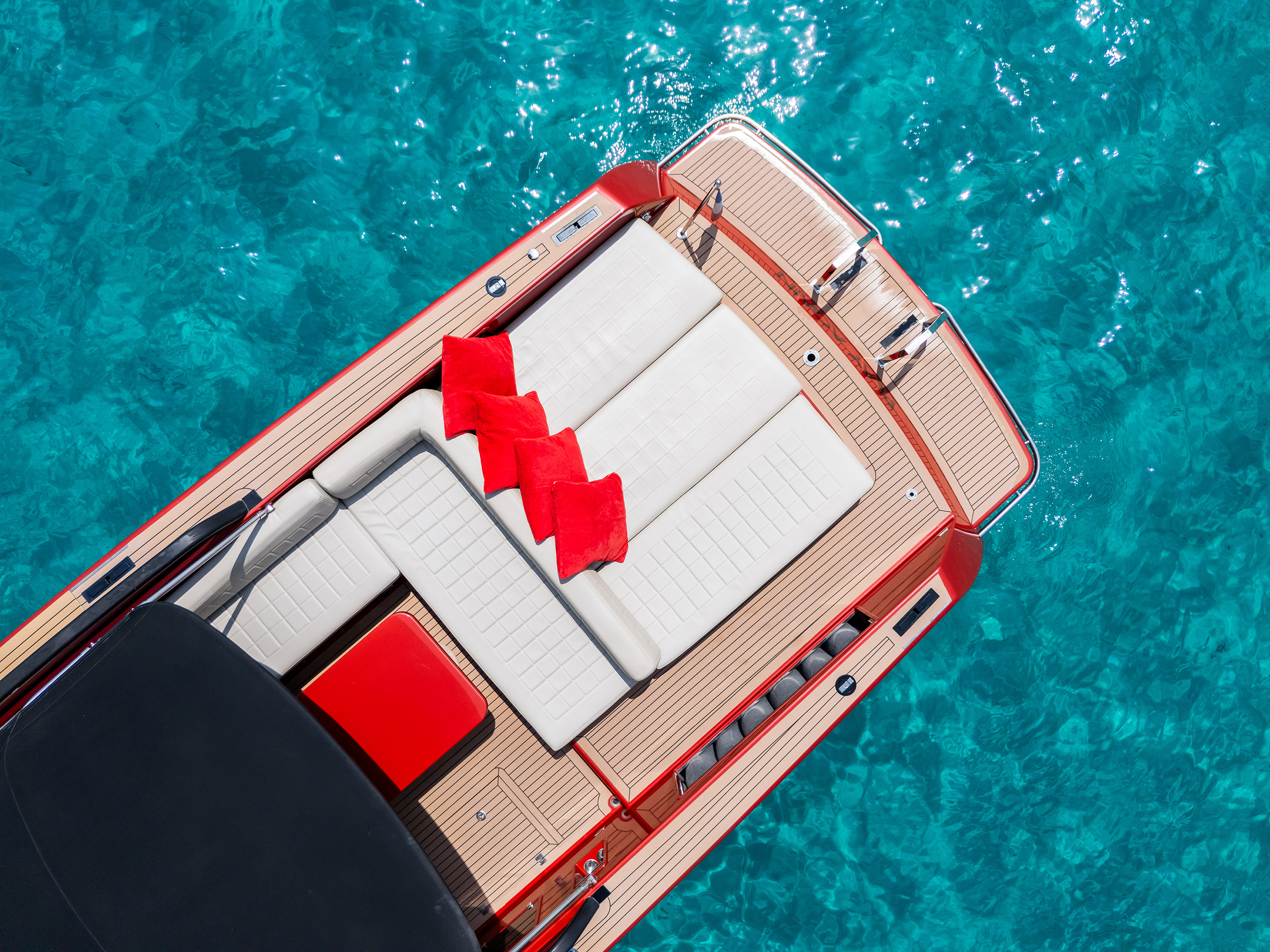 Équipements : Bain de soleil arrière, Taud de soleil cockpit + Extension du taud sur bain de soleil arrière, Grande table de cockpit, Plateforme de bain, système audio premium, réfrigérateur, douche de pont.