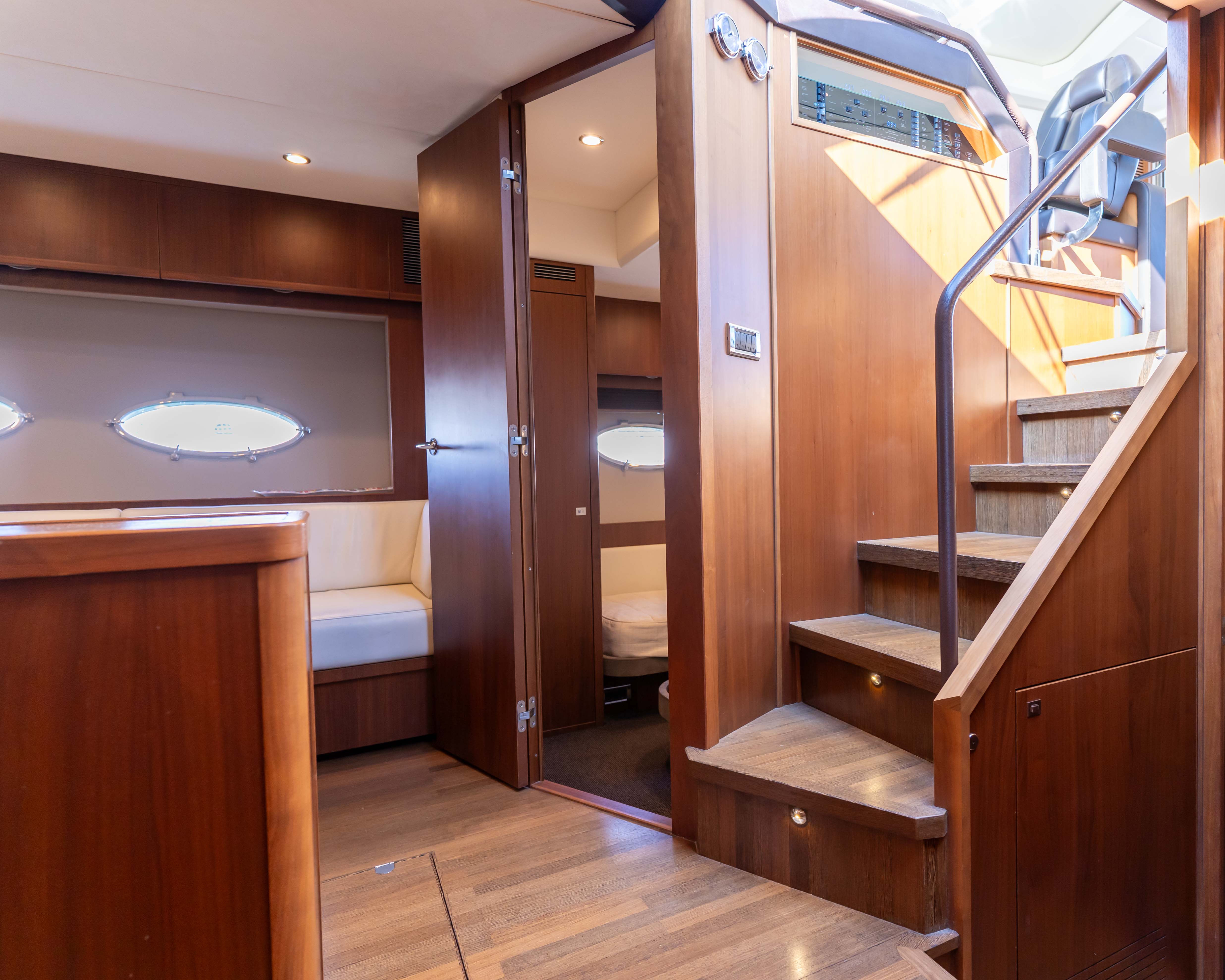 A L’INTERIEUR : Vous trouverez directement un salon supérieur ouvert sur le pont principal, puis au pont inférieur 3 cabines dont 2 avec lit double, et une cabine avec 2 lits simples, 2 salles de bain. Toutes les cabines sont climatisées, il y a également une cuisine équipée (plan de travail, combiné four/Micro-Onde, machine à café, grand réfrigérateur, plaque de cuisson vitrocéramique).